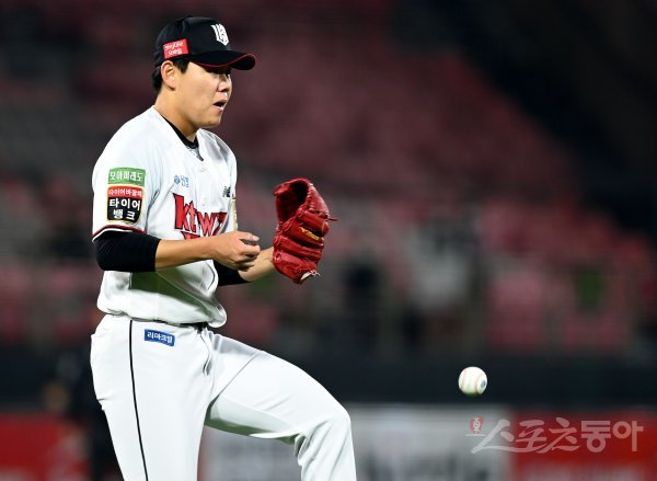 20일 경기도 수원 kt위즈파크에서 ‘2022 신한은행 SOL KBO리그’ kt 위즈와 키움 히어로즈의 준PO 4차전 경기가 열렸다. 2회초 2사에서 kt 선발 소형준이 투수 앞 땅볼 타구를 잡으려다 실책을 범하고 있다.