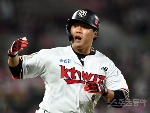 20일 경기도 수원 kt위즈파크에서 ‘2022 신한은행 SOL KBO리그’ kt 위즈와 키움 히어로즈의 준PO 4차전 경기가 열렸다. 3회말 1사에서 kt 강백호가 솔로 홈런을 쏘아 올린 후 환호하고 있다.