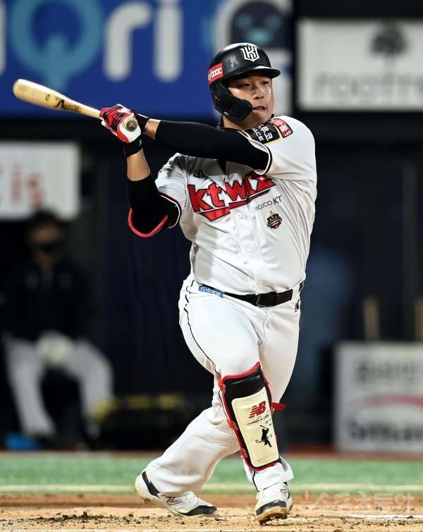 20일 경기도 수원 kt위즈파크에서 ‘2022 신한은행 SOL KBO리그’ kt 위즈와 키움 히어로즈의 준PO 4차전 경기가 열렸다. 1회말 1사에서 kt 강백호가 안타를 날리고 있다.
