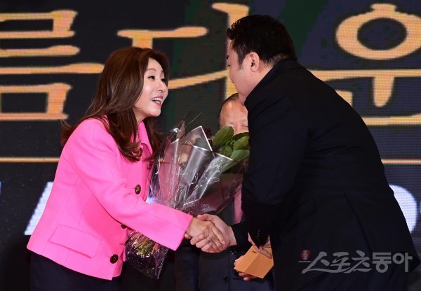 20일 서울 강동구 고덕동 스테이지28에서 열린 ‘제12회 아름다운 예술인상’ 시상식에서 배우 마동석이 최명길로부터 꽃다발을 받고 있다.