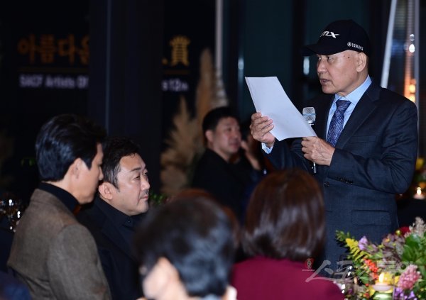 20일 서울 강동구 고덕동 스테이지28에서 열린 ‘제12회 아름다운 예술인상’ 시상식에서 신영균예술문화재단 안성기 이사장이 인사말을 하고 있다.