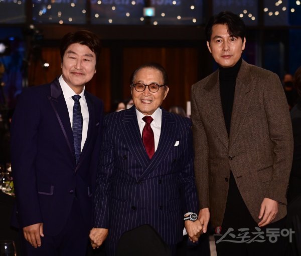 20일 서울 강동구 고덕동 스테이지28에서 열린 ‘제12회 아름다운 예술인상’ 시상식에 앞서 원로배우 신영균(가운데)과 배우 송강호, 정우성이 포즈를 취하고 있다.