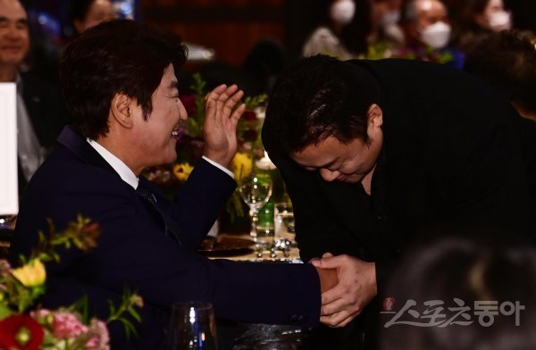 20일 서울 강동구 고덕동 스테이지28에서 열린 ‘제12회 아름다운 예술인상’ 시상식에 앞서 배우 송강호와 마동석이 인사하고 있다.