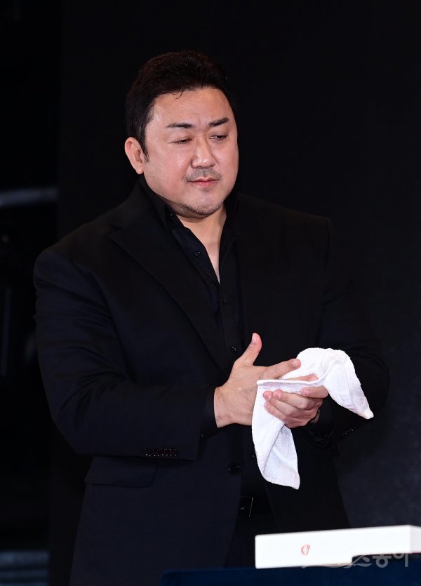 20일 서울 강동구 고덕동 스테이지28에서 열린 ‘제12회 아름다운 예술인상’ 시상식에서 배우 마동석이 핸드프린팅을 마친 후 손을 닦고 있다.