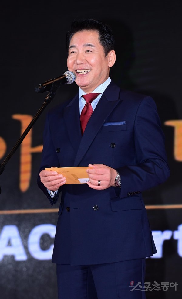20일 서울 강동구 고덕동 스테이지28에서 열린 ‘제12회 아름다운 예술인상’ 시상식에서 배우 박상원이 연극예술인 부문 수상자를 발표하고 있다.