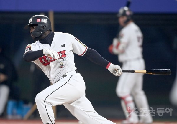 20일 수원KT위즈파크에서 ‘2022 신한은행 MY CAR KBO리그’ 준플레이오프 4차전 키움 히어로즈와 KT 위즈 경기가 열렸다. 5회말 2사 1,2루 KT 알포드가 동점 적시타를 치고 있다.
