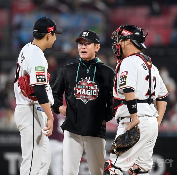 20일 수원KT위즈파크에서 ‘2022 신한은행 MY CAR KBO리그’ 준플레이오프 4차전 키움 히어로즈와 KT 위즈 경기가 열렸다. 3회초 1사 KT 이강철 감독이 마운드에 올라 선발 소형준과 이야기하고 있다.
