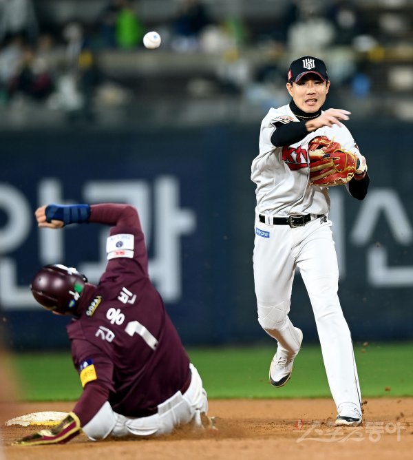 20일 경기도 수원 kt위즈파크에서 ‘2022 신한은행 SOL KBO리그’ kt 위즈와 키움 히어로즈의 준PO 4차전 경기가 열렸다. 4회초 1사 1, 2루에서 내야땅볼 때 kt 심우준이 키움 1루 주자 김웅빈을 2루에서 포스 아우시킨 후 1루로 송구하고 있다.