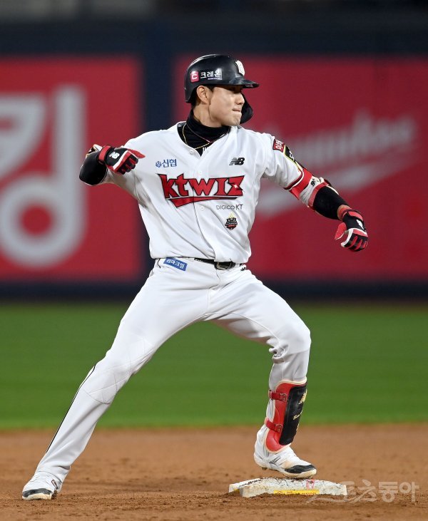 20일 수원KT위즈파크에서 ‘2022 신한은행 MY CAR KBO리그’ 준플레이오프 4차전 키움 히어로즈와 KT 위즈 경기가 열렸다. 6회말 1사 2루 KT 심우준이 1타점 중전 2루타를 치고 2루에서 기뻐하고 있다.