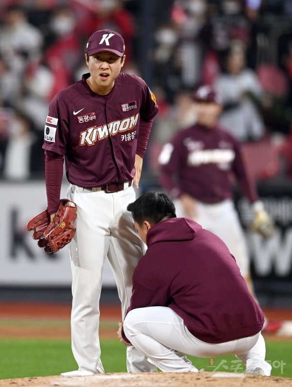 20일 수원KT위즈파크에서 ‘2022 신한은행 MY CAR KBO리그’ 준플레이오프 4차전 키움 히어로즈와 KT 위즈 경기가 열렸다. 6회말 무사 키움 김동혁이 타구에 맞아 고통스러워하고 있다.