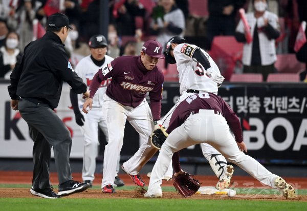 20일 수원KT위즈파크에서 ‘2022 신한은행 MY CAR KBO리그’ 준플레이오프 4차전 키움 히어로즈와 KT 위즈 경기가 열렸다. 6회말 무사 키움 김동혁이 다리에 맞고 굴절된 공을 잡으려 했으나 놓치고 있다.