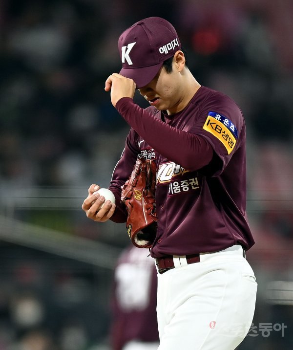 20일 경기도 수원 kt위즈파크에서 ‘2022 신한은행 SOL KBO리그’ kt 위즈와 키움 히어로즈의 준PO 4차전 경기가 열렸다. 6회말 1사 2루에서 실점을 허용한 키움 김동혁이 아쉬워하고 있다.