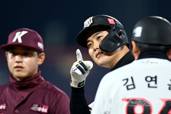 20일 경기도 수원 kt위즈파크에서 ‘2022 신한은행 SOL KBO리그’ kt 위즈와 키움 히어로즈의 준PO 4차전 경기가 열렸다. 6회말 1사 2루에서 kt 배정대가 1타점 적시타를 날린 후 세리머니를 펼치고 있다.