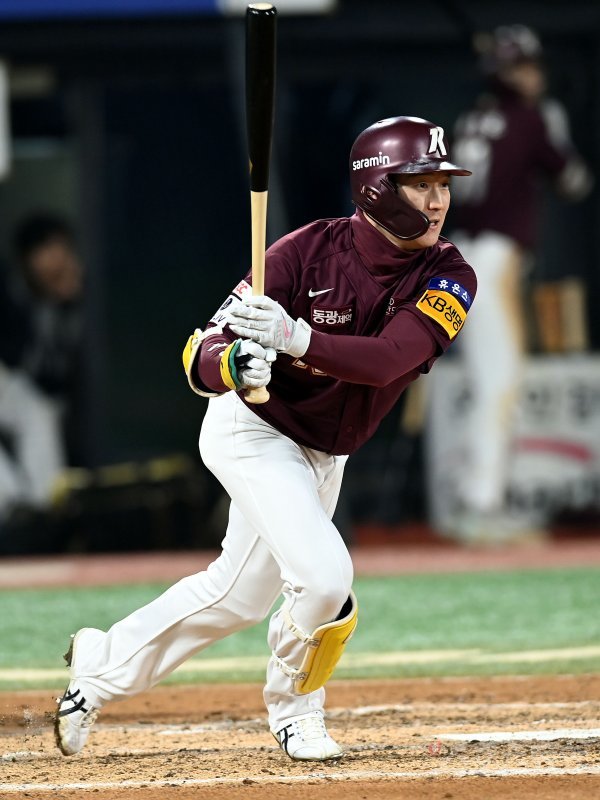 20일 경기도 수원 kt위즈파크에서 ‘2022 신한은행 SOL KBO리그’ kt 위즈와 키움 히어로즈의 준PO 4차전 경기가 열렸다. 7회초 무사 1, 2루에서 키움 김준완이 1타점 적시타를 날리고 있다.