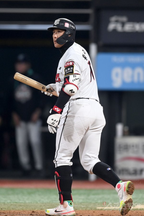 20일 수원KT위즈파크에서 ‘2022 신한은행 MY CAR KBO리그’ 준플레이오프 4차전 키움 히어로즈와 KT 위즈 경기가 열렸다. 7회말 무사 1,2루 KT 황재균이 2타점 좌전 2루타를 친 후 타구를 바라보고 있다.
