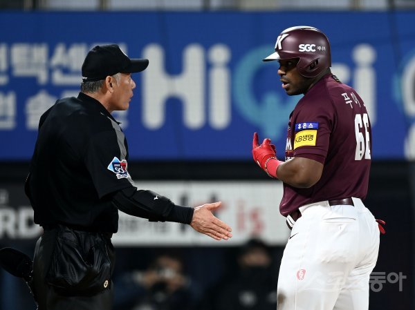 20일 경기도 수원 kt위즈파크에서 ‘2022 신한은행 SOL KBO리그’ kt 위즈와 키움 히어로즈의 준PO 4차전 경기가 열렸다. 8회초 무사에서 키움 푸이그가 삼진 아웃으로 물러나며 심판에게 항의하고 있다.