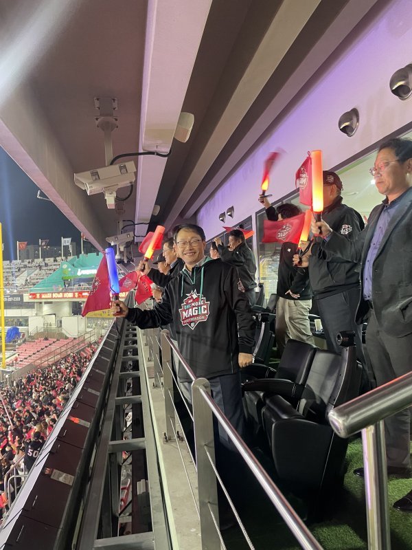 구현모 KT 위즈 구단주가 가을야구를 펼치는 선수들을 응원하기 위해 20일 키움 히어로즈와 준플레이오프(PO·5전3선승제) 4차전이 펼쳐진 수원KT위즈파크를 방문했다.