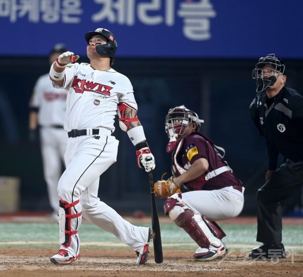 20일 수원KT위즈파크에서 ‘2022 신한은행 MY CAR KBO리그’ 준플레이오프 4차전 키움 히어로즈와 KT 위즈 경기가 열렸다. 8회말 1사 1루 KT 박병호가 좌측 펜스에 맞는 안타를 날리고 있다.