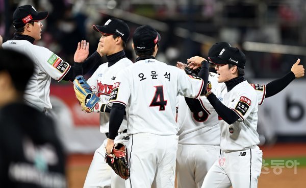 20일 경기도 수원 kt위즈파크에서 ‘2022 신한은행 SOL KBO리그’ kt 위즈와 키움 히어로즈의 준PO 4차전 경기가 열렸다. kt가 키움을 상대로 9-6으로 승리한 후 선수들이 그라운드에서 기쁨을 나누고 있다.