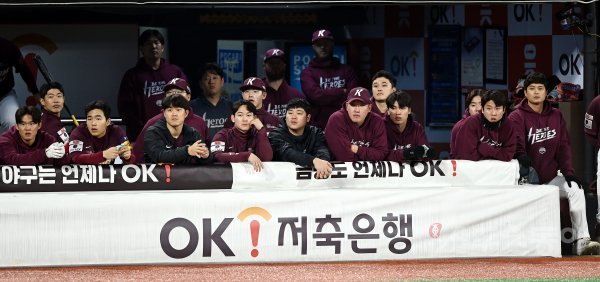 20일 경기도 수원 kt위즈파크에서 ‘2022 신한은행 SOL KBO리그’ kt 위즈와 키움 히어로즈의 준PO 4차전 경기가 열렸다. 6-9로 뒤진 키움의 9회초 마지막 공격 때 선수들이 경기를 지켜보고 있다.