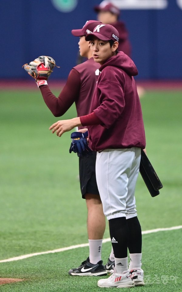 22일 서울 고척스카이돔에서 열린 ‘2022 신한은행 SOL KBO리그’ 준플레이오프 5차전 키움 히어로즈와 KT 위즈의 경기에 앞서 키움 이정후가 동료들과 이야기하고 있다.