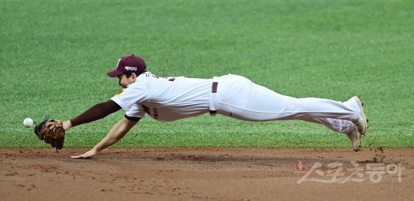 22일 서울 고척스카이돔에서 열린 ‘2022 신한은행 SOL KBO리그’ 준플레이오프 5차전 키움 히어로즈와 KT 위즈의 경기에서 1회초 무사 KT의 안타 때 키움 김휘집이 몸을 날렸지만 볼을 놓치고 있다.