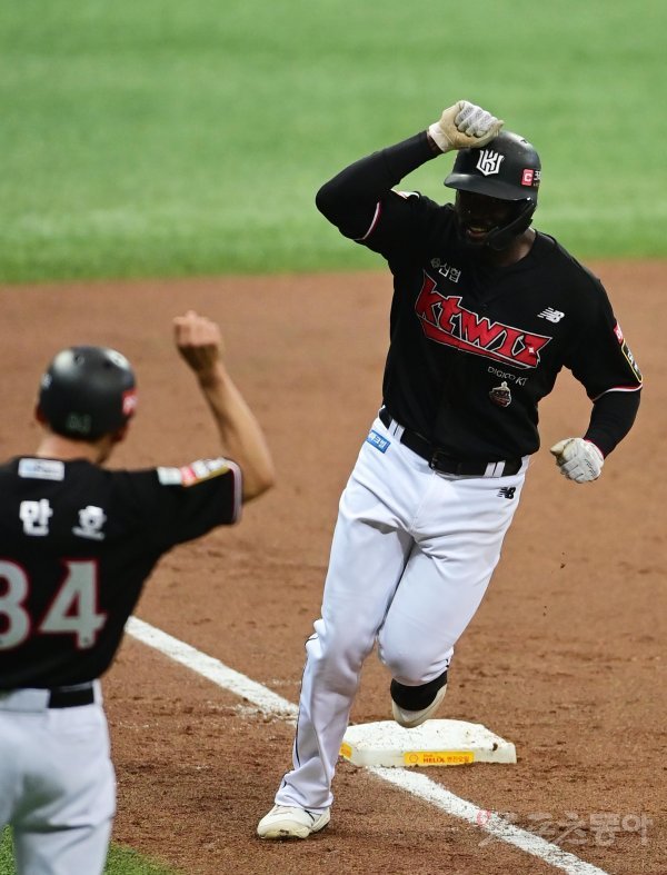 22일 서울 고척스카이돔에서 열린 ‘2022 신한은행 SOL KBO리그’ 준플레이오프 5차전 키움 히어로즈와 KT 위즈의 경기에서 3회초 2사 KT 알포드가 좌월 솔로 홈런을 친 후 세리머니를 하고 있다.
