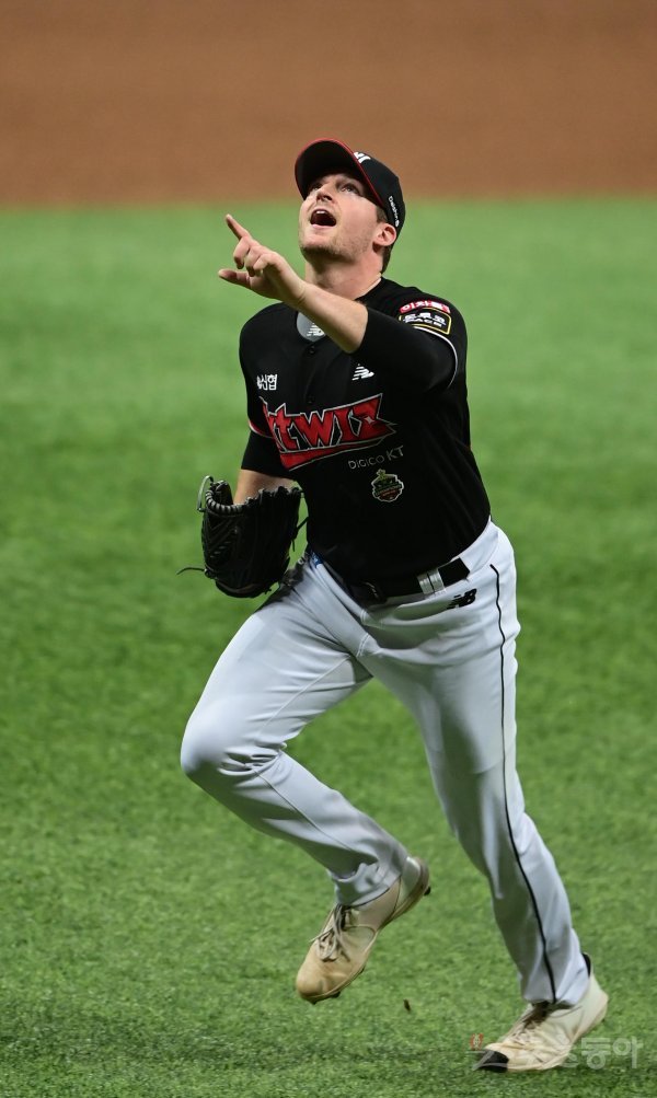 22일 서울 고척스카이돔에서 열린 ‘2022 신한은행 SOL KBO리그’ 준플레이오프 5차전 키움 히어로즈와 KT 위즈의 경기에서 4회말 2사 2루 키움의 포수 뒤 뜬공 때 KT 벤자민이 볼을 쫓고 있다.