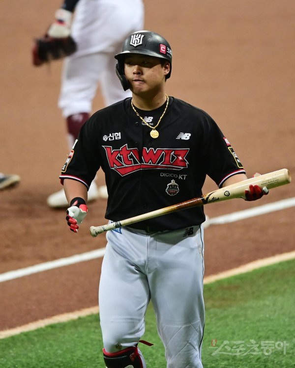 22일 서울 고척스카이돔에서 열린 ‘2022 신한은행 SOL KBO리그’ 준플레이오프 5차전 키움 히어로즈와 KT 위즈의 경기에서 1회초 1루 KT 강백호가 뜬공으로 아웃된 후 아쉬워하고 있다.