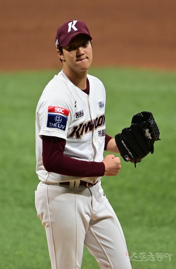 22일 서울 고척스카이돔에서 열린 ‘2022 신한은행 SOL KBO리그’ 준플레이오프 5차전 키움 히어로즈와 KT 위즈의 경기에서 6회초 1사 2, 3루 KT 황재균을 삼진으로 돌려세운 키움 안우진이 주먹을 쥐고 있다.
