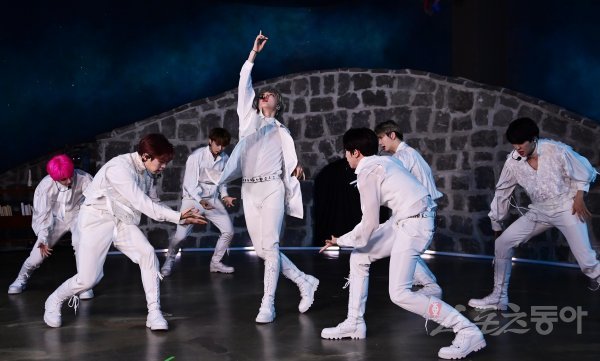 그룹 킹덤이 22일 고양 덕양구 대덕동 한 스튜디오에서 열린 주튀르키예한국문화원 개원 11주년 킹덤 케이팝 온라인 콘서트에서 ‘승천’ 무대를 펼치고 있다. 한국과 튀르키예 수교 65주년을 맞는 해인 올해는 형제의 나라라고 부를 만큼 친밀한 관계를 맺고 있다. 양국 문화에 대해 깊이 이해하고 가까워지는 기회로 주튀르키예한국문화원 유튜브를 통해 온라인 콘서트가 열렸다.