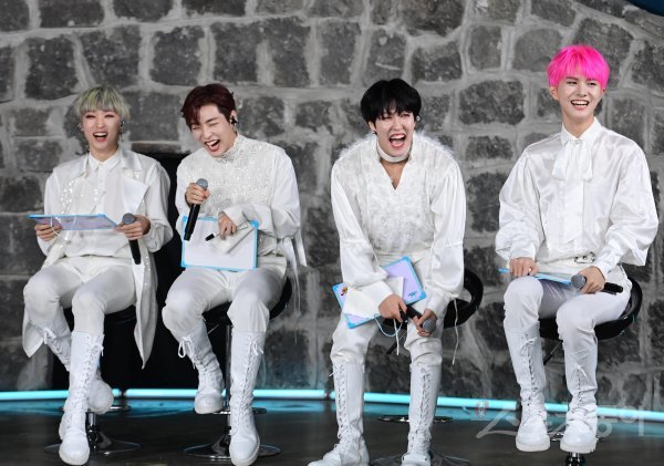 그룹 킹덤 아서, 무진, 루이, 아이반이 22일 고양 덕양구 대덕동 한 스튜디오에서 열린 주튀르키예한국문화원 개원 11주년 킹덤 케이팝 온라인 콘서트에서 질문에 답하며 웃고 있다.한국과 튀르키예 수교 65주년을 맞는 해인 올해는 형제의 나라라고 부를 만큼 친밀한 관계를 맺고 있다. 양국 문화에 대해 깊이 이해하고 가까워지는 기회로 주튀르키예한국문화원 유튜브를 통해 온라인 콘서트가 열렸다.