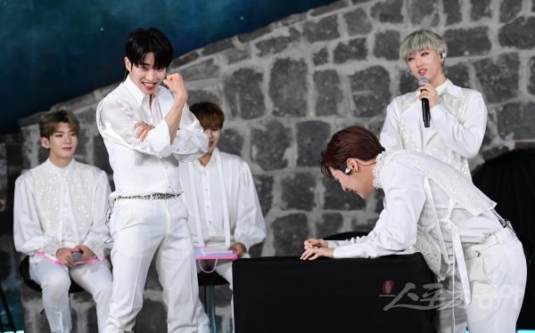 그룹 킹덤 단이 22일 고양 덕양구 대덕동 한 스튜디오에서 열린 주튀르키예한국문화원 개원 11주년 킹덤 케이팝 온라인 콘서트에서 무진에게 팔씨름을 이긴 후 포즈를 취하고 있다. 한국과 튀르키예 수교 65주년을 맞는 해인 올해는 형제의 나라라고 부를 만큼 친밀한 관계를 맺고 있다. 양국 문화에 대해 깊이 이해하고 가까워지는 기회로 주튀르키예한국문화원 유튜브를 통해 온라인 콘서트가 열렸다.