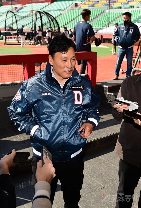 23일 인천 SSG랜더스필드에서 열린 KBO리그 SSG 랜더스와 두산 베어스의 연습경기에 앞서 두산 이승엽 감독이 취재진과 인터뷰를 하고 있다.