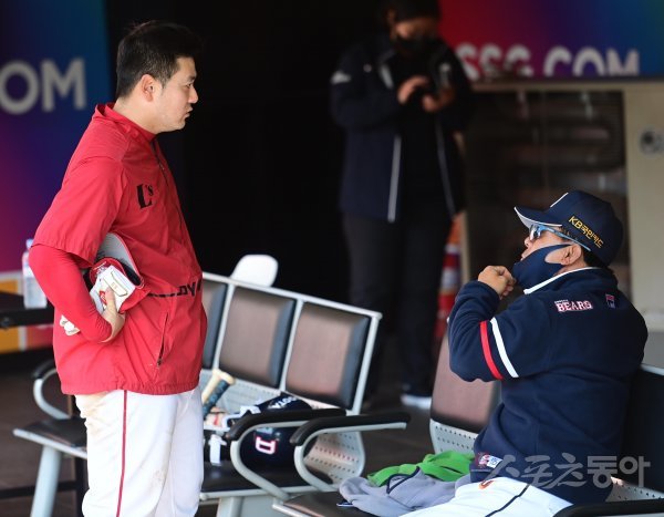 23일 인천 SSG랜더스필드에서 열린 KBO리그 SSG 랜더스와 두산 베어스의 연습경기에 앞서 두산 이정훈 2군 감독과 SSG 최주환이 이야기하고 있다.