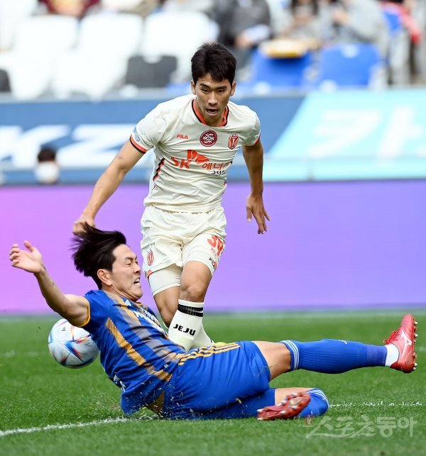 23일 울산 문수월드컵경기장에서 열린 ‘하나원큐 K리그1 2022’ 울산 현대와 제주 유나이티드의 경기에서 제주 김명순의 슛을 울산 김영권이 몸으로 막아내고 있다.