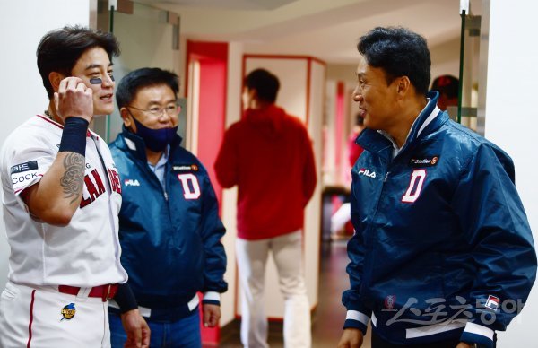 23일 인천 SSG랜더스필드에서 열린 KBO리그 SSG 랜더스와 두산 베어스의 연습경기에 앞서 SSG 추신수와 두산 이승엽 감독이 인사하고 있다.