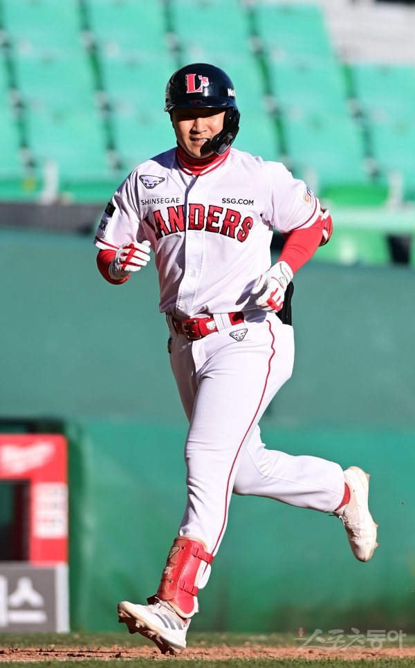 23일 인천 SSG랜더스필드에서 열린 KBO리그 SSG 랜더스와 두산 베어스의 연습경기에서 6회말 2사 SSG 최경모가 좌월 솔로 홈런을 친 후 그라운드를 돌고 있다.