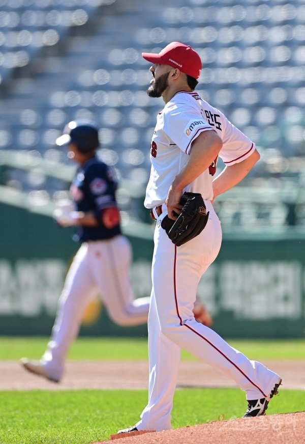 23일 인천 SSG랜더스필드에서 열린 KBO리그 SSG 랜더스와 두산 베어스의 연습경기에서 1회초 2사 1, 2루 두산에 스리런을 허용한 SSG 모리만도가 아쉬워하고 있다.