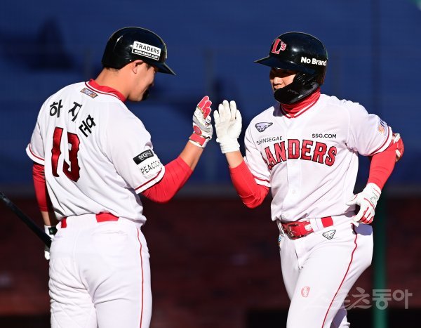 23일 인천 SSG랜더스필드에서 열린 KBO리그 SSG 랜더스와 두산 베어스의 연습경기에서 6회말 2사 SSG 최경모가 좌월 솔로 홈런을 친 후 동료와 하이파이브를 하고 있다.