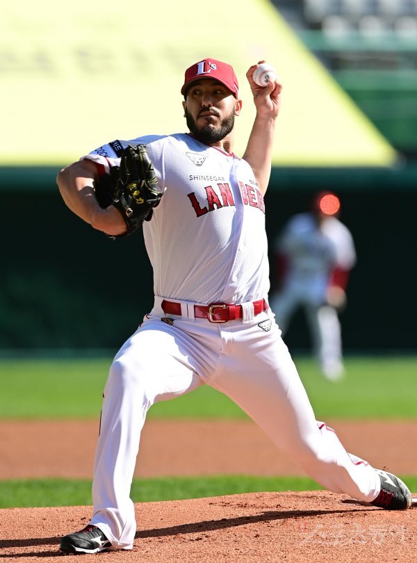 23일 인천 SSG랜더스필드에서 열린 KBO리그 SSG 랜더스와 두산 베어스의 연습경기에서 선발 투수로 마운드에 오른 SSG 모리만도가 역투하고 있다.