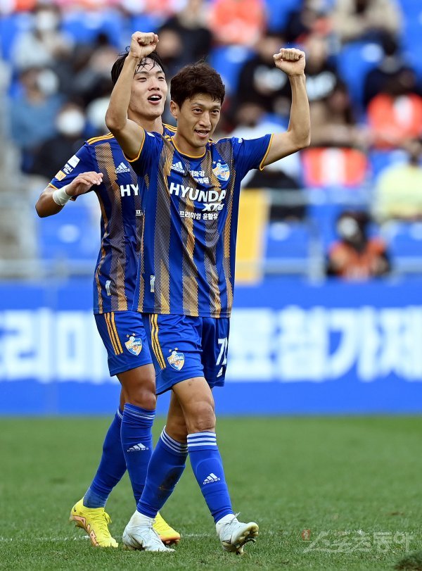 23일 울산 문수월드컵경기장에서 열린 ‘하나원큐 K리그1 2022’ 울산 현대와 제주 유나이티드의 경기에서 울산 이청용이 골을 넣은 후 환호하고 있다.
