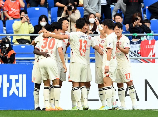 23일 울산 문수월드컵경기장에서 열린 ‘하나원큐 K리그1 2022’ 울산 현대와 제주 유나이티드의 경기에서 제주 서진수가 동점골을 넣은 후 동료들과 기쁨을 나누고 있다.