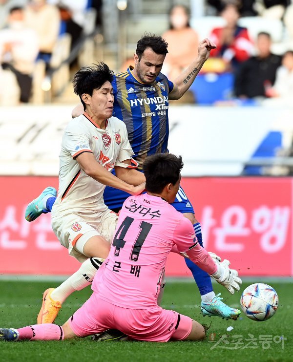 23일 울산 문수월드컵경기장에서 열린 ‘하나원큐 K리그1 2022’ 울산 현대와 제주 유나이티드의 경기에서 울산 바코가 골키퍼와 1:1 찬스에서 슛을 시도하고 있다.
