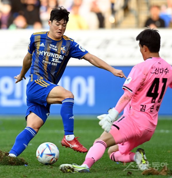 23일 울산 문수월드컵경기장에서 열린 ‘하나원큐 K리그1 2022’ 울산 현대와 제주 유나이티드의 경기에서 울산 이규성 골키퍼와 1:1 찬스에서 슛을 시도하고 있다.
