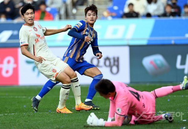 23일 울산 문수월드컵경기장에서 열린 ‘하나원큐 K리그1 2022’ 울산 현대와 제주 유나이티드의 경기에서 울산 설영우의 슛이 골키퍼에 막히고 있다.