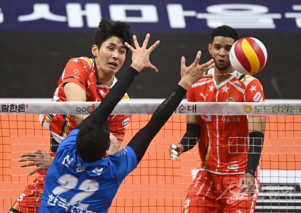 23일 안산상록수체육관에서 열린 ‘2022~2023 도드람 V-리그’ 남자부 OK금융그룹과 한국전력 경기에서 OK금융그룹 지태환이 한국전력의 블로킹 사이로 스파이크를 날리고 있다.