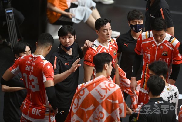 23일 안산상록수체육관에서 열린 ‘2022~2023 도드람 V-리그’ 남자부 OK금융그룹과 한국전력 경기에서 OK금율그룹 석진욱 감독이 작전 지시를 하고 있다.
