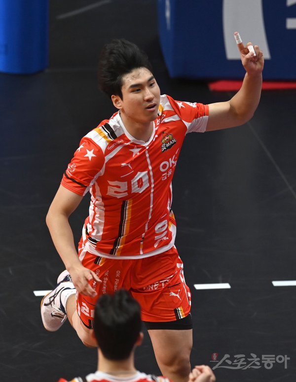 23일 안산상록수체육관에서 열린 ‘2022~2023 도드람 V-리그’ 남자부 OK금융그룹과 한국전력 경기에서 OK금율그룹 신호진이 블로킹 득점에 성공한 후 기뻐하고 있다.