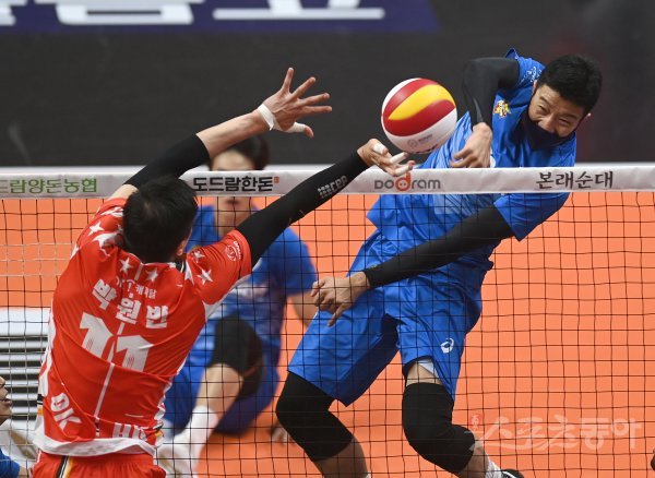 23일 안산상록수체육관에서 열린 ‘2022~2023 도드람 V-리그’ 남자부 OK금융그룹과 한국전력 경기에서 한국전력 신영석이 OK금융그룹의 블로킹 사이로 스파이크를 날리고 있다.
